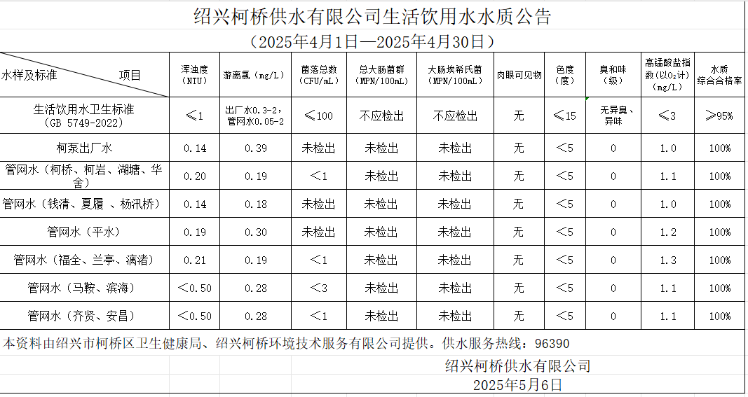 生活飲用水水質公告(2025年4月1日—2025年4月30日)