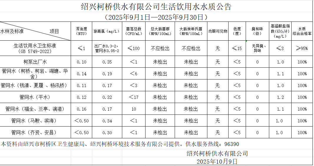 生活飲用水水質(zhì)公告(2025年9月1日—2025年9月30日)