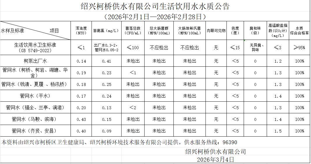 生活飲用水水質公告(2026年2月1日—2026年2月28日)