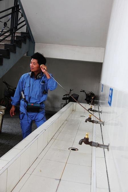 圖為供水公司聽漏人員對(duì)學(xué)校供水管道進(jìn)行聽漏