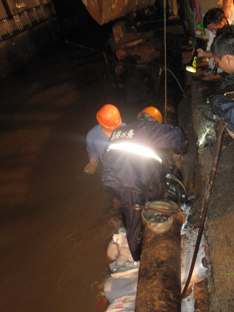 21點10分,搶險準備工作全部完畢,供水管道搶修工作正式開始。搶險隊員分成兩隊實施搶修,在不到6米寬的狹長道路上,搶險隊員在被湍急洪水沖刷掏空的路基上,冒著隨時坍塌的危險,全然不顧個人安危沖鋒在前,狂風大雨下,突擊隊只有一個信念:就是要搶時間,趕進度,盡快讓全鎮百姓第二天能正常用水!